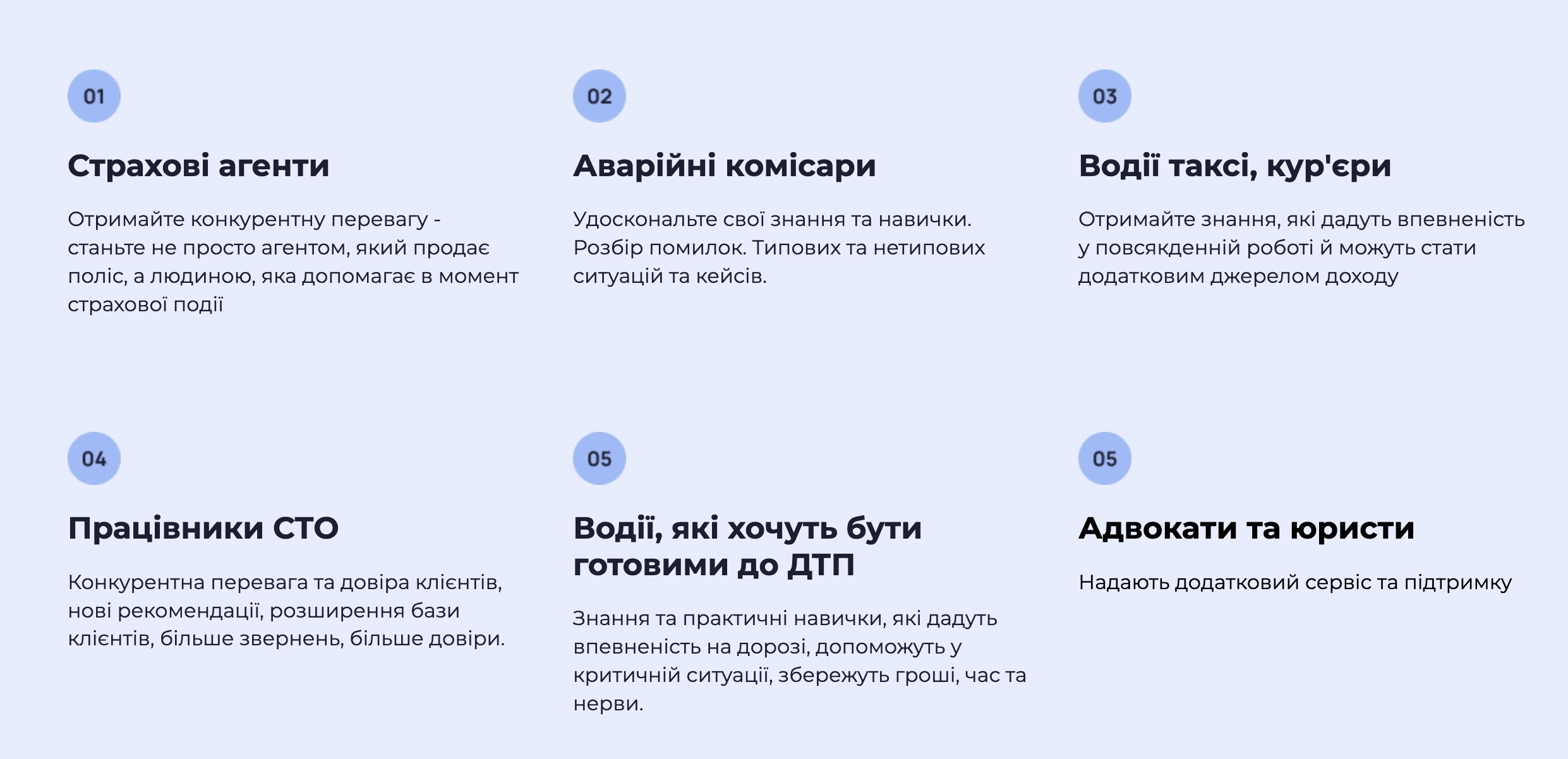 1. Базові уроки - типові та нестандартні ДТП; доступ до реального досвіду; практичні кейси; розуміння всіх нюансів оформлення європротоколу.